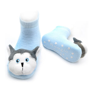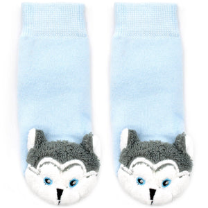 Answer the call of the wild with these baby wolf Boogie Toes! A sky blue sock provides the perfect backdrop for these little gray wolves that will ensure your child stands out from the pack! Rubber grip-bottoms provide traction for new walkers. And friendly stuffed wolf cub faces double as rattles. Boogie Toes are the perfect addition to any kid wardrobe and make great gifts too! 100% Combed Cotton Rattle Accessory Sock. Hand Linked. 80% Cotton / 15% Nylon / 5% Spandex