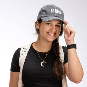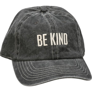 A cotton baseball cap from our Caps & Beanies Collection featuring an adjustable brass enclosure on the back. Features a box sign style embroidered "Be Kind" sentiment. Our Be Kind baseball hat is one size fits most. Hand-wash only.