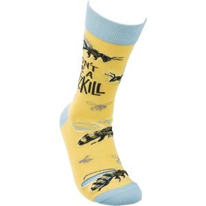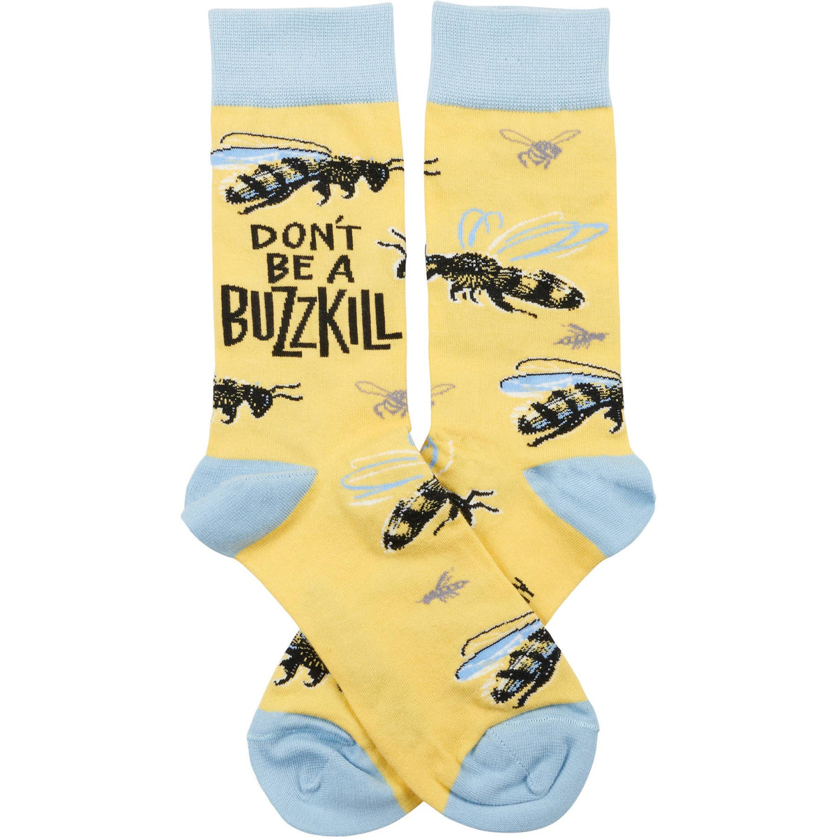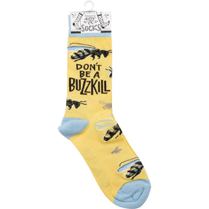 A pair of colorful woven socks from the LOL Made You Smile Collection displaying hand illustrated designs of bees with "Don't Be A Buzzkill" sentiment. Socks feature a one size fits most design made with cotton, nylon, and spandex. A fun everyday accessory perfect for self-expression or gifting on any occasion.