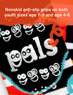 These sea-faring mismatched socks will make you nostalgic for the 90s and 00s! Meet Julius the Monkey and Skurvy the Pirate Skull! These socks are the perfect accessory for any kids pirate costumes this Halloween. Let's be Pals! We don't have to match to be besties. DETAILS • Crew-length tube socks for toddlers and kids • Non-Slip Grips for safety • Unisex fit for boys and girls • Designs are woven in (never printed on) • Image quality stays great when these fun socks are worn and stretched! • Super stretchy, comfy socks everyone loves. • Medium-weight, quality thickness • Combed Cotton 76% Polyester 13% Nylon 9% Spandex 2% • A fun birthday gift!