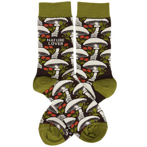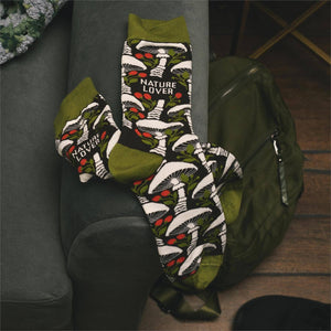 Give anyone that steps into personal space a vibe check with this pair of colorful socks displaying a relaxing mushroom pattern with an earthy sentiment that reads "Nature Lover." Questionables socks are made with cotton, nylon, and spandex to create a one-size-fits-most design. Our Nature Lover socks are perfect for maximizing chill at home or gifting to pass that feeling to someone who needs it. Colorful and cozy socks always make a great gift that offer many ways to express themselves every day.